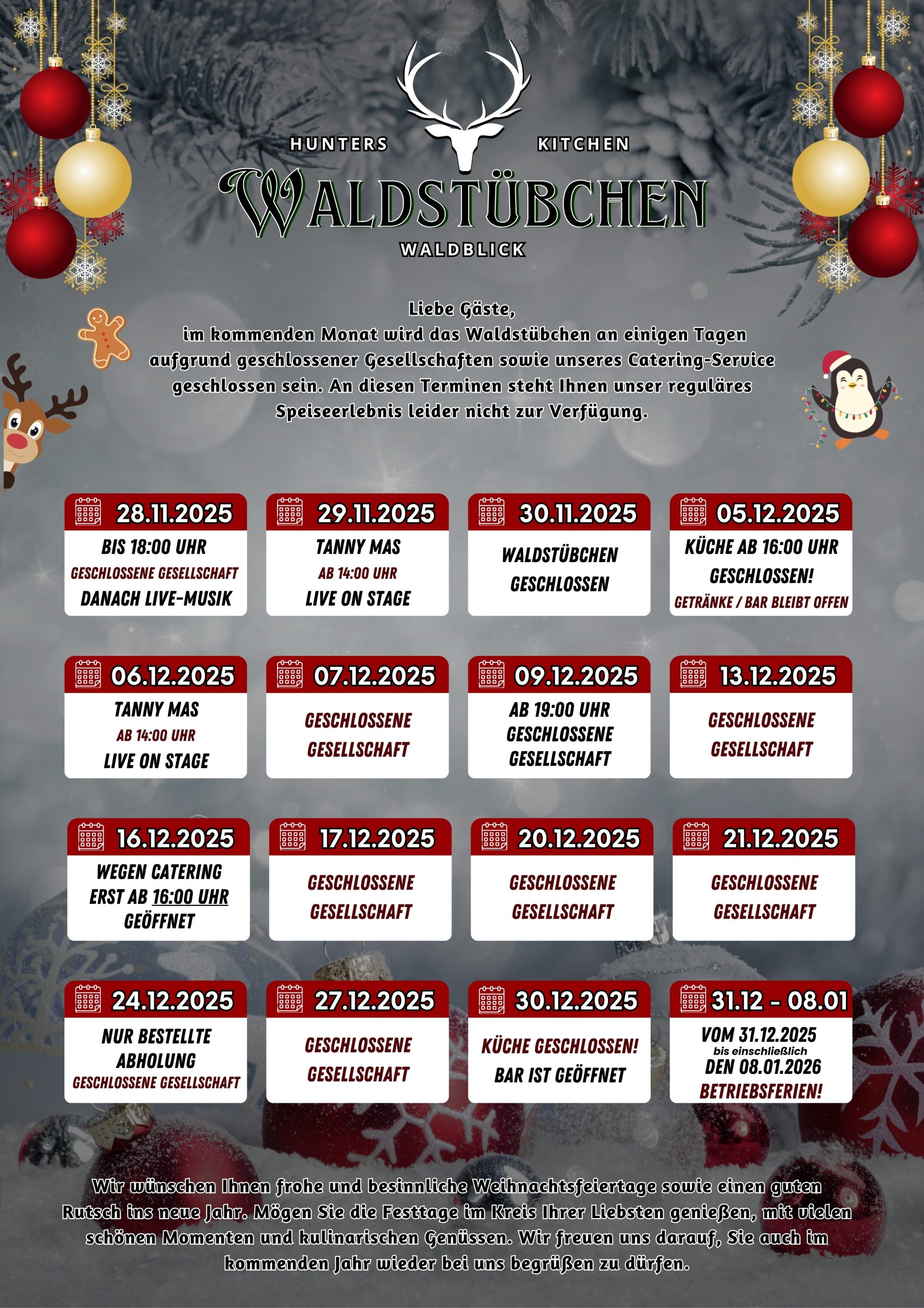 Bitte beachten: an einzelnen Tagen, wenn der Cateringservice genutzt wird, kann es dazu kommen, dass das Waldstübchen kurzfristig geschlossen hat.