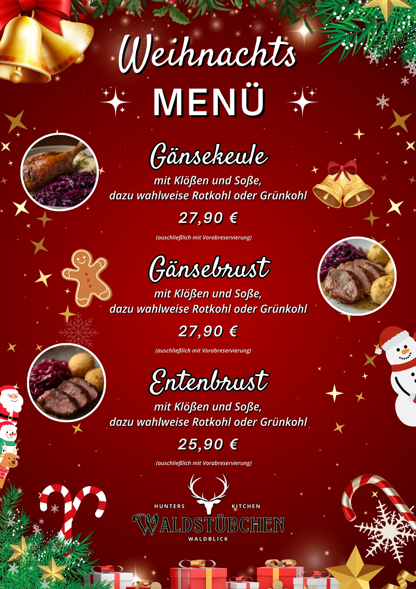 ab sofort bieten wir Ihnen unsere festliche Weihnachtsmenükarte an. Tauchen Sie ein in eine besinnliche Geschmackserfahrung mit sorgfältig ausgewählten Gänsekeulen, Gänsebrust oder auch Entenbrust. Ob klassisch mit Grünkohl oder lieber mit Rotkohl.