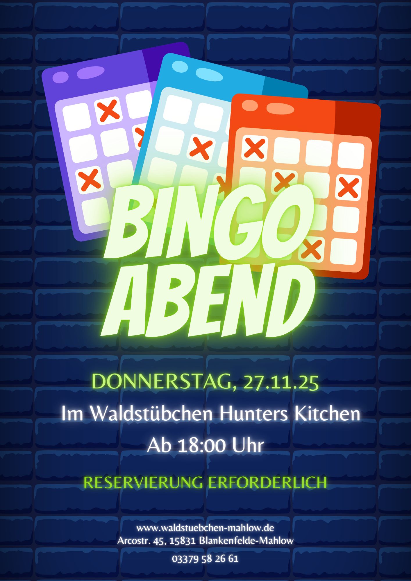 Am 27.11.2025, ab 18 Uhr, findet unser legendärer Bingo-Abend, bei uns im Waldstübchen statt.